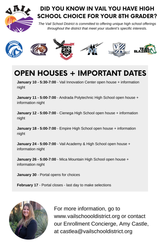 The Vail School District believes in providing parents with a choice of the high school that their children attend. Our community in partnership with the school district has created six unique high schools from which parents can choose.