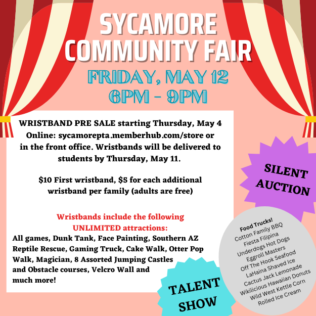 Stop by the Talent Show and see the amazing abilities of our Sycamore Scorpions... and don't forget the PTA's Silent Auction, they've been working hard to find great items for our Sycamore Community.